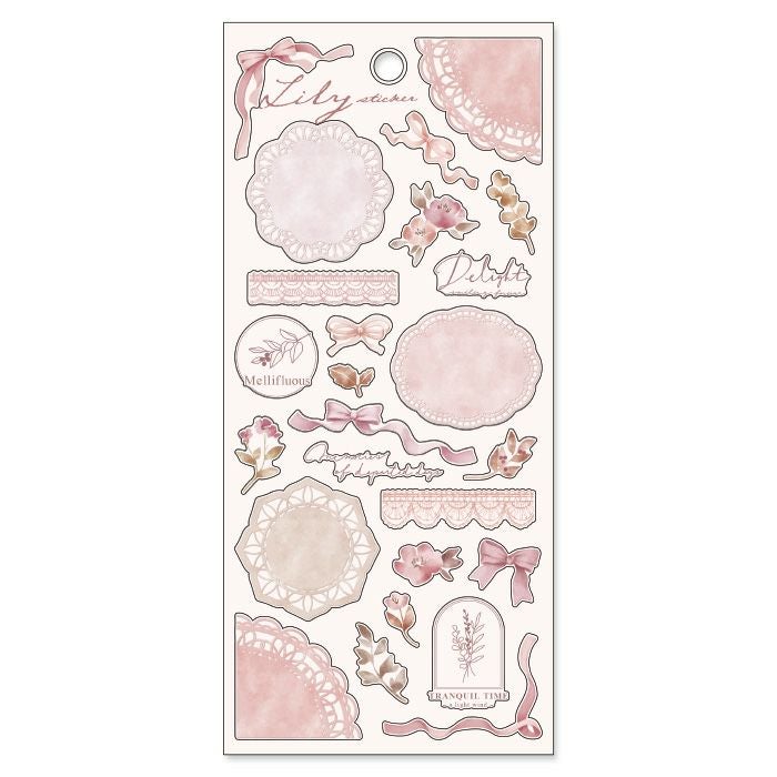 レースとリボンをテーマにした、女性らしいはかない雰囲気のシールです。
